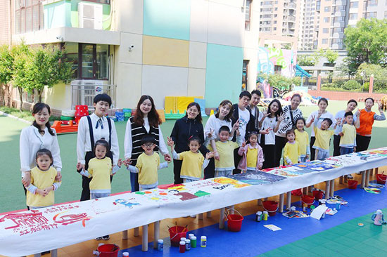 红黄蓝幼儿园的彩绘长卷“中华民族一家亲”与象征着时代精神、民族力量的“龙头”画布顺利接龙,红黄蓝小朋友和家长一起见证这一历史时刻。