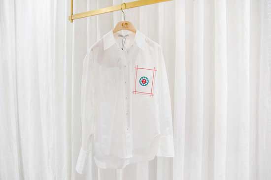 由超模吕燕创建的品牌Commo Moi也借由这次机会推出联名款合作款衬衫。衬衫不仅延续了品牌一贯对面料上的高品质要求,细节之处的设计也在呼应成都民众的生活面貌。在前片口袋上添加了一筒和红中的花型,将成都人最为喜爱的麻将巧妙融入到设计中。衬衫后领的“要得”是成都话“好的”的意思,借用幽默诙谐的成都方言来体现成都地方文化性格。