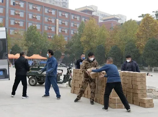 11 月 9 日,在云生集团真福利平台总经理吕天永、郑州公司负责人高克志的共同协调组织下,第一时间成立了疫情物资捐赠小组。作为郑州升达经贸管理学院曾经的学生,吕天永负责此次捐赠活动,在他的带领下,团队很快到达仓库,在领取物资时,按照仓库防疫政策要求,每支团队只能一人代表进入,吕总不顾有伤在身、毅然坚决地进入仓库领取。