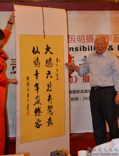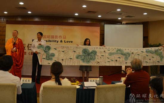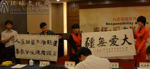 环球文化网(www.hqwhw.com)讯:9月9日,央视焦点访谈记者孙国明摄影作品“责任·爱主题研讨会暨《爱在大同》摄影作品出版发布会”在北京召开。本次研讨会由中国摄影出版社主办,大同市市长耿彦波,中国摄影出版社社长赵迎新、中国新闻摄影学会常务副主席胡颖、全国政协和委员,著名书画集李延声等百余名嘉宾出席了研讨会。环球文化网执行主编王绍军特邀请了中科院国家科学图书馆原副馆长、著名书法家辛希孟、北京大学李可染艺术研究会会长徐佩元、中国首创滚彩水墨书画家杨章联、中国道家书画院常务院长林贵春等六位在京书画家出席了本次研讨发布会,并现场为大同市捐献了书画力作。