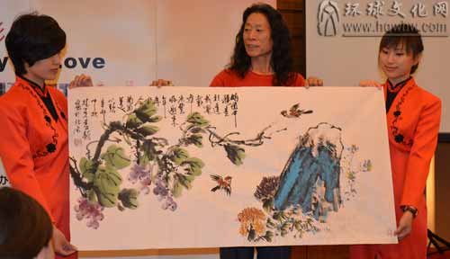 书法家辛希孟教授深为孙国明这种传播和坚守大爱的精神所感怀,题书:“大鹏六月有闲意,仙鹤千年无倦客”,并倡导向孙国明同志学习。北大李可染艺术研究会会长徐佩元带来五米莲花长卷《爱在大同·佛光普照》,寄语大同:佛爱众生与孙国明的这种责任与坚守是殊途同归的。中国首创滚彩水墨书画家杨章联先生更是带来了巨幅娇艳欲滴的《珠翠满园》葡萄图,寓意大同市旧城改造硕果累累和市民欣欣向荣和谐繁华的新气象。(小辉)