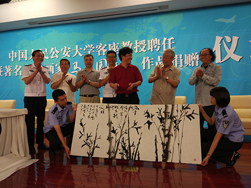 中国人民公安大学客座教授聘任暨著名山水画家马万国先生作品捐赠仪式6月7日在中国人民公安大学木樨地校区研究生楼学术报告厅举行,全国公安文联主席祝春林、中国工程院院士郭应禄、国家民族画院执行院长胡宝利、中国人民公安大学党委书记樊京玉等出席,中国人民公安大学党委副书记黄祖跃主持捐赠仪式。