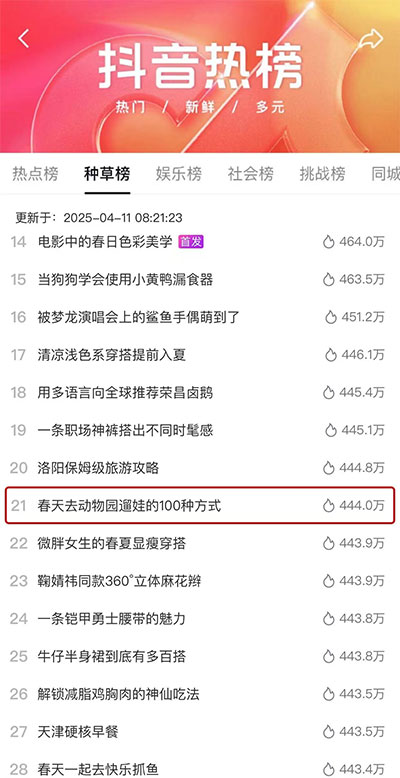 与此同时,平台进一步以达人为媒介链接线上线下,策划热点话题找到对话的机会点。头部亲子达人@SASA的丸子妹、@王十一与陈老虎、@朵朵吖 等达人奔赴动物园,分享遛娃趣事,其所拍摄的沉浸式体验内容迅速引发家长群体共鸣。在达人效应的带动下,#春天去动物园遛娃的100种方式 话题热度呈几何级攀升,登上抖音种草榜,成为春日亲子出行的讨论焦点。