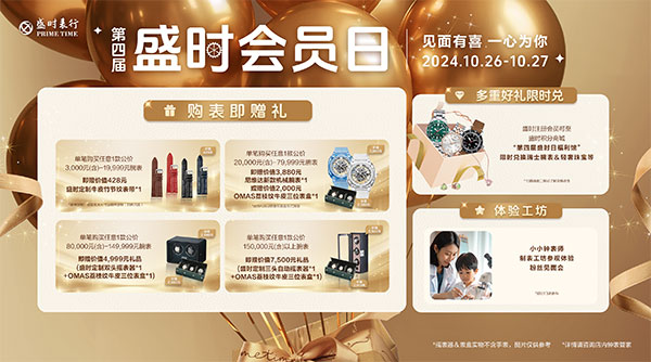 时光荏苒,岁月如梭。在我国高端腕表零售行业领军品牌盛时的引领下,第四届盛时会员日于十月的最后一个周末盛大启幕。全国300多家盛时表行门店为会员们带来一场前所未有的奢华体验,限时积分兑换、会员专享礼遇、尊享到店体验等四重礼遇,只为让您感受到盛时满满的诚意。