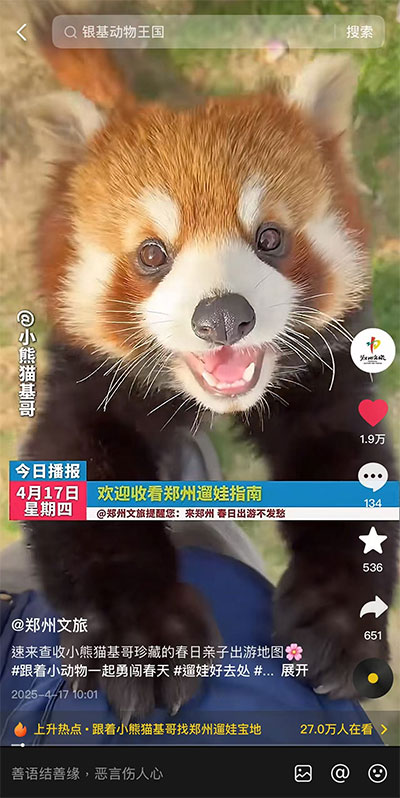 随着#春天去动物园遛娃的100种方式、#人类幼崽在动物园随地大小演 等话题热度飙升,很多亲子达人们分享在动物园的亲子温馨瞬间,以及 “玩中有学” 的经验,如引导孩子观察动物习性、培养观察力和好奇心等,为其他家庭提供了宝贵参考,也构建起 “遛娃” 交流场。在“交流场”内家长们可跟随官方活动节奏,通过为各地顶流“动物明星”打call,逐步建立孩子对自然的向往,让亲子出行双方都能满怀期待,更为商家提供了亲子营销新思路。