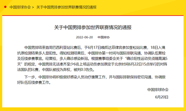 人民网北京6月21日电 (记者胡雪蓉)6月20日晚,中国排协通过官网发布《关于中国男排参加世界联赛情况的通报》,表示中国男排在抵达菲律宾参加2022年世界排球联赛奎松站比赛时,入境抗原检测结果多人显阳性,经复检多人确诊感染新冠,因无法凑齐至少6名上场运动员参加对阵法国队的比赛,中国队被视为弃权,被判0:3告负。